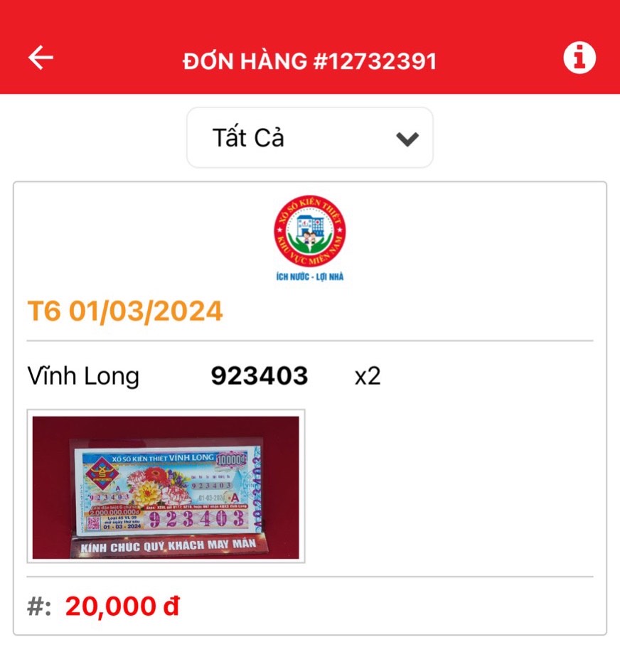 • Thông tin bộ số thanh toán thành công: Ngày vé, Đài, Bộ số, Số lượng vé, Tổng số tiền đã thanh toán